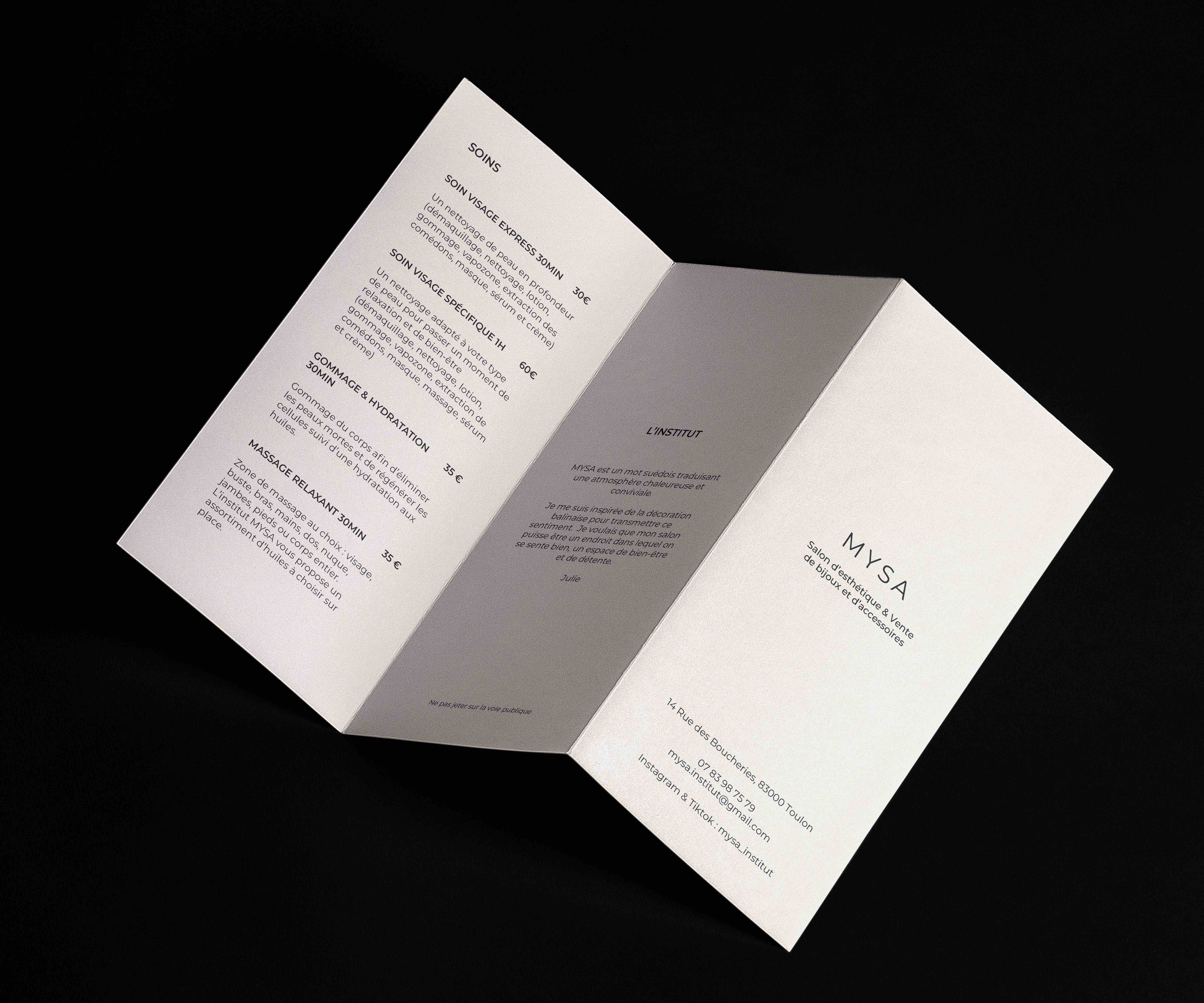 Lancé en 2023 à Toulon, Mysa est un institut de beauté qui incarne la quête du bien-être à travers une approche moderne, chic et personnalisée. En plus de concevoir son identité visuelle, j’ai accompagné la cliente dans le choix du nom, "Mysa". L’identité visuelle a été pensée pour refléter cette vision : une image actuelle qui véhicule des valeurs de calme, de bien-être et de sophistication.